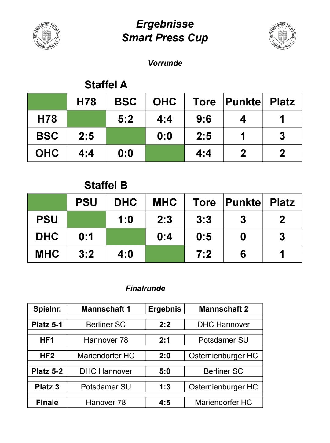 Folgende Ergebnisse wurden beim Smart Press Cup erzielt: